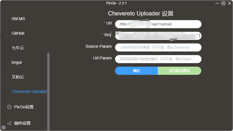 然后点击图床设置中的chevereto uploader 填入自己的api地址和api key就完成了